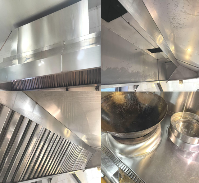 本次清洗工作范围广泛,覆盖了集烟罩、油烟机净化装置、排油烟管道、油篦子以及排油烟风机等多个核心部位。在清洗过程中,工作人员严格按照专业标准和规范流程进行操作,不放过任何一个细节。通过清洗前后的图片记录对比,效果十分显著。清洗前,油烟机设备上油污堆积厚重,有较大安全隐患。而清洗后,整个油烟机设备焕然一新,烟罩风口干净透亮,墙壁灶台挡火板洁白如新,净化器净化仓内无一丝油污残留,风机和管道也恢复了原本的洁净,运行起来更加顺畅高效。